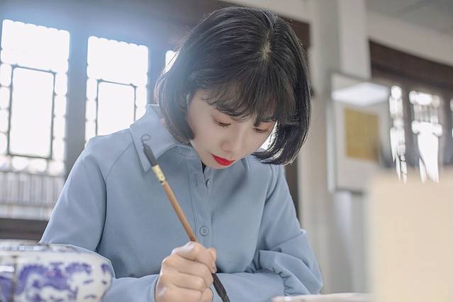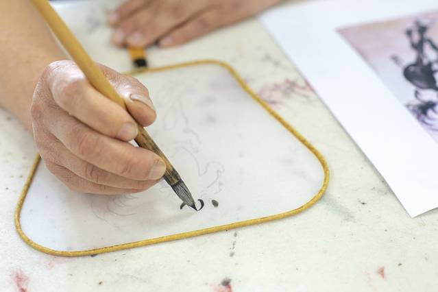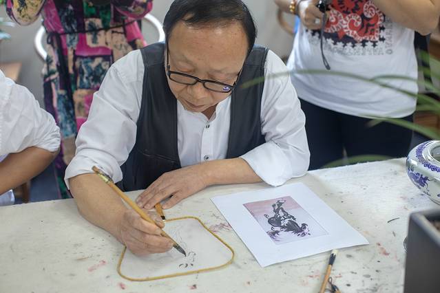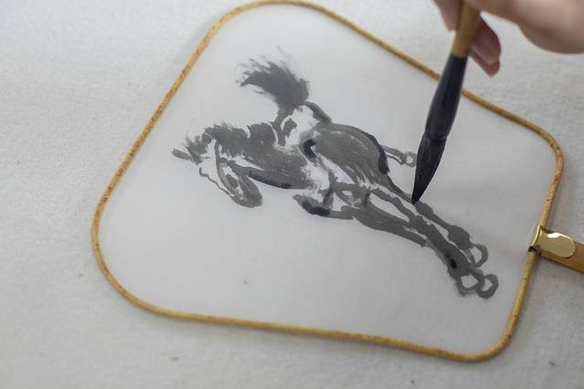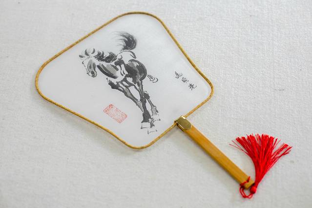 热情的馆长早已将工具备好,为了让我们顺利完成作品,还提前在扇面上描了轮廓,如此一来,我们只需依葫芦画瓢,即便没有任何挥绘画功底,也能完成一幅像样的作品。