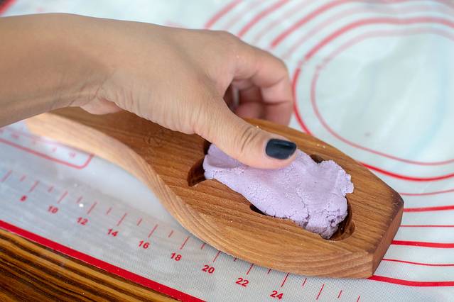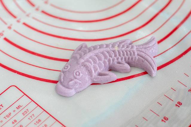 此次黎里之行,我们来到了迎祥文旅,体验了一把制作缆船糕的乐趣。黄色的南瓜面粉,紫色的紫薯面粉,看上去酷似小时候玩的橡皮泥,然后将其紧紧摁在模具中,将表面多余的面粉抚平去除,最后形成一个个生动的缆船糕,有的呈现鲤鱼状,有的绘有花鸟图,让人爱不释手。在大锅的烹饪下,一块块缆船糕色泽鲜艳,口感软糯,美味至极。