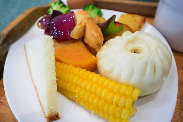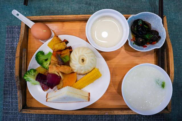 餐厅也在一楼,早餐是酒店搭配好的营养早餐,有鸡蛋、鲜榨的豆浆、稀饭、还有各种蔬菜!相当丰富,份量也很充足!