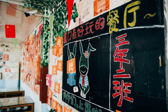 在曾厝垵的巷子里,坐落着一间“学校”,80年代的校园风格,里面却是餐厅,服务员叫老师,客人叫同学,老板叫校长,点单叫测试卷,买单叫交学费,一瞬回到属于自己的青涩青春里。(地址:曾厝垵社9号2楼)