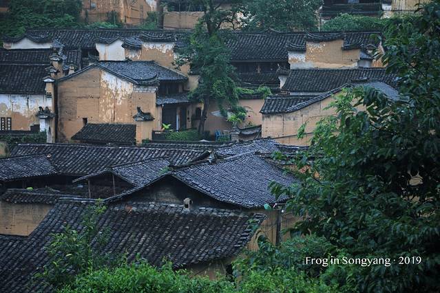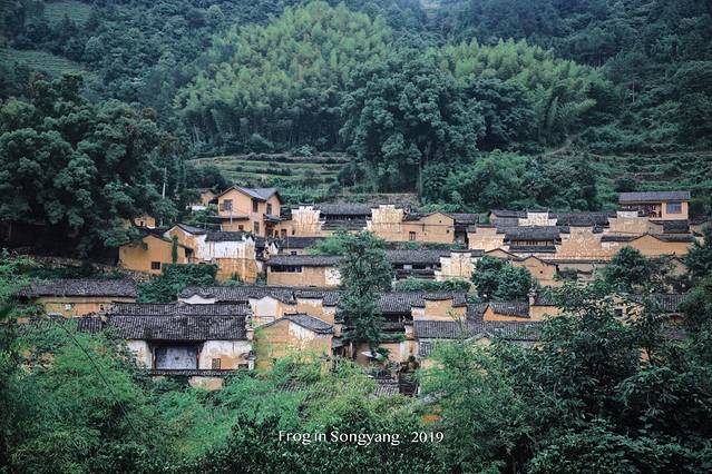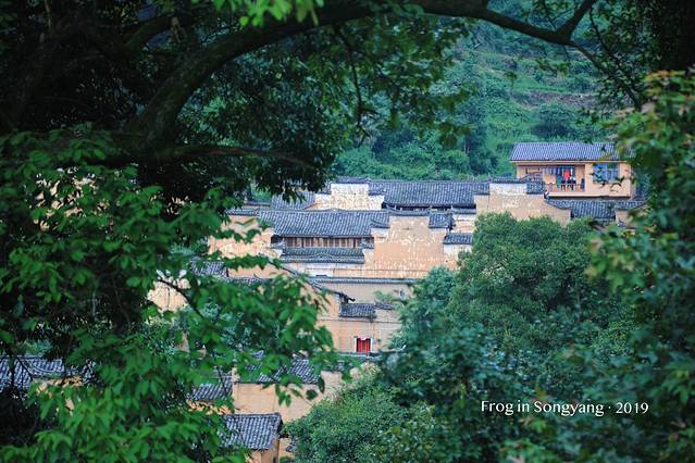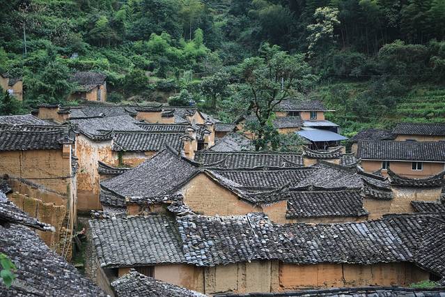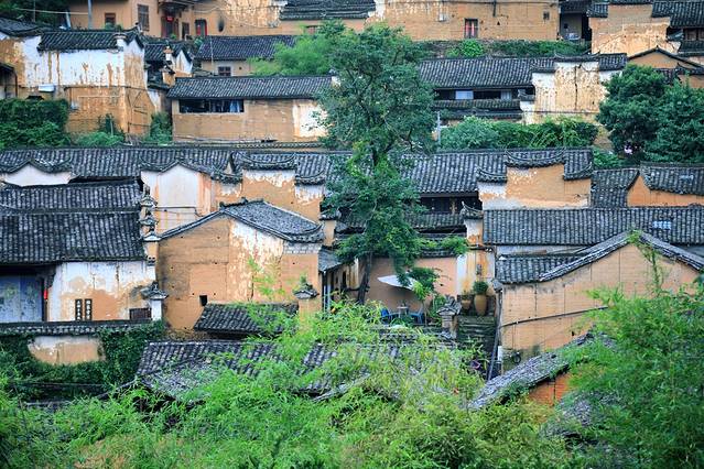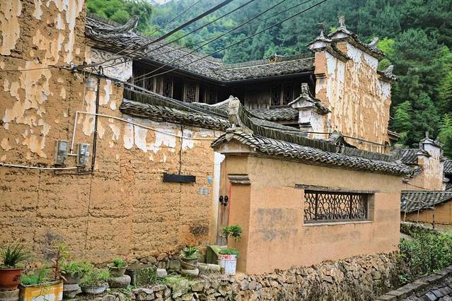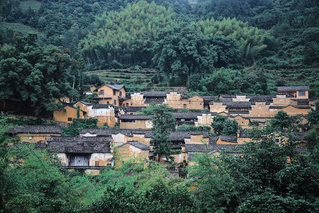 整个村庄上下屋高低落差约2至3米,伸展高层200米,形成了5层18幢土木架构的气势宏大的清代民居群。黄色的外墙,灰色的瓦片,鳞次栉比的房屋,小溪流过的村落,从远处望去,像是金色的“小布达拉宫”。