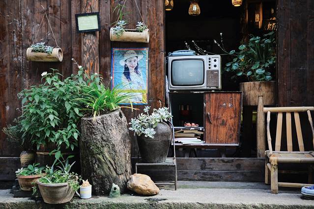屋里摆放着高大的绿植,木质的桌椅和这老屋再搭配不过。