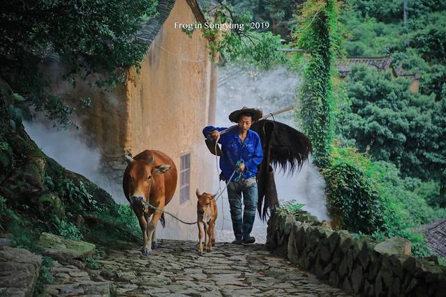 ▲炊烟升腾中放牛归来的邻家大伯