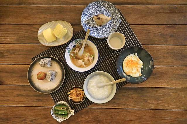 早饭,从9个大小碗碟开始,粽子、咸菜、清粥、玉米、煎蛋、水果,一应俱全。