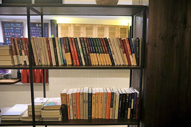 吧台的对面是一面书架。