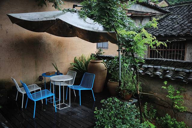 红柿院里,种满绿植的露台正适合与朋友品茶谈天;若是雨天,则可以听阶前雨声点滴到天明。