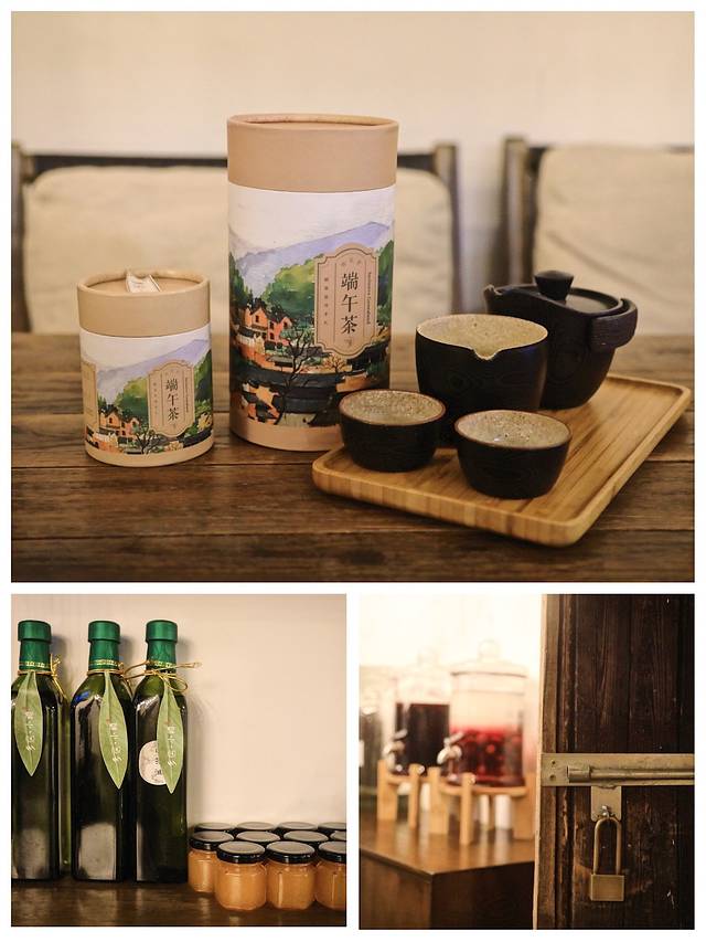 进屋的木架上摆满了当地的特产,有端午茶、蜂蜜、茶油、自酿的梅子酒。
