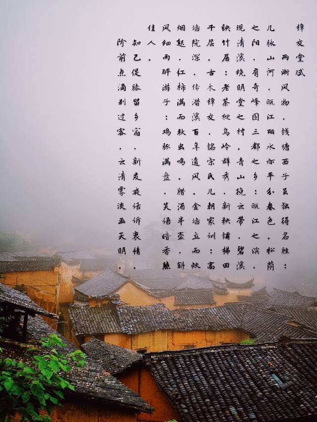 两浙风物,钱塘西子虽独得名胜;几脉山河,瓯江 丽水 亦平分春色。松荫之阳,有奇峰围 三都 之乡;瓯江之滨,现清溪绕明堂之村。青山挽云带,碧溪映竹居;老茶枕乌岭群秀,新秧铺梯田千层。古木樟交,铭宋氏几朝家训;高墙院深,传潜溪百年遗风。金墙立而炊烟起,红柿满而秋虫鸣。腊酒半壶,斜风细雨醉游子;鸡豚满盘,笑语暗香照佳人。