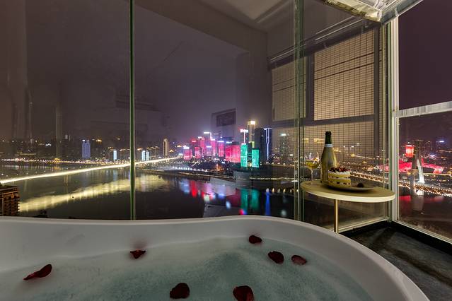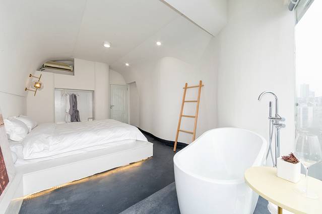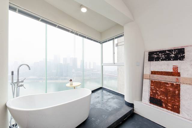不光位置绝版,整套设计采用了希腊岩洞,弧顶圆窗极简设计,每个房间都特别大。主卧室,270度江景,我们在玻璃幕墙旁安置了浴缸,可躺在浴缸中欣赏山城夜景。