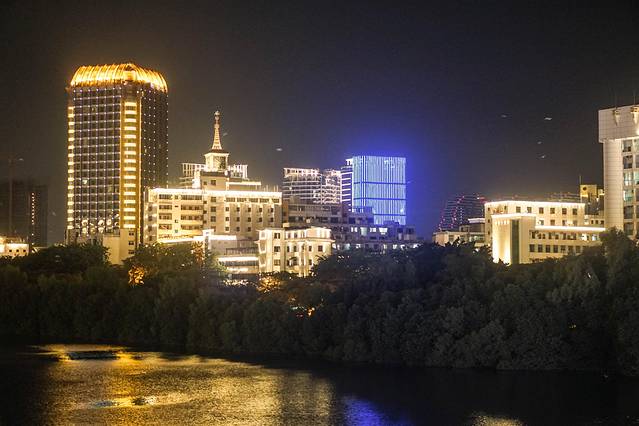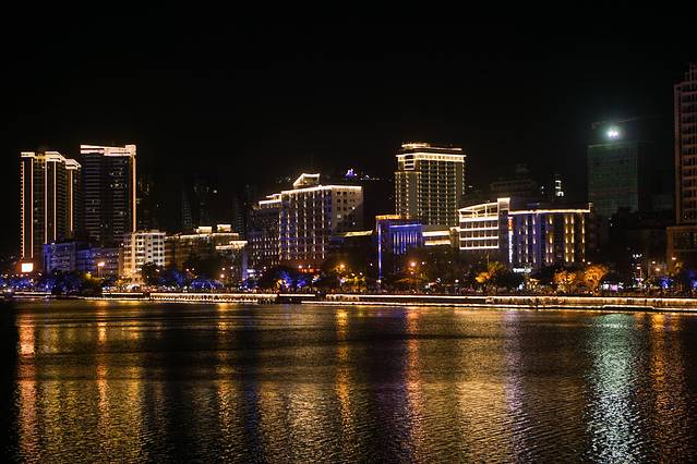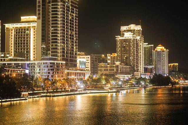 夜幕中,我吹着海风,沿着三亚河慢慢地走。看着河面平静地就像一面镜子,把高楼大厦的光芒收揽在怀中,折射出来美丽的幻影,给这个夜里增添了几分浪漫色彩。