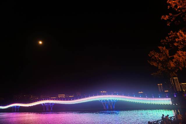 情人桥坐落于三亚河岸之上,富有设计感的曲线形状,像蛇精一般婀娜多姿。夜晚时分不断变换着颜色,就像跳跃的音符萦绕在河面之上。