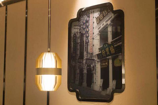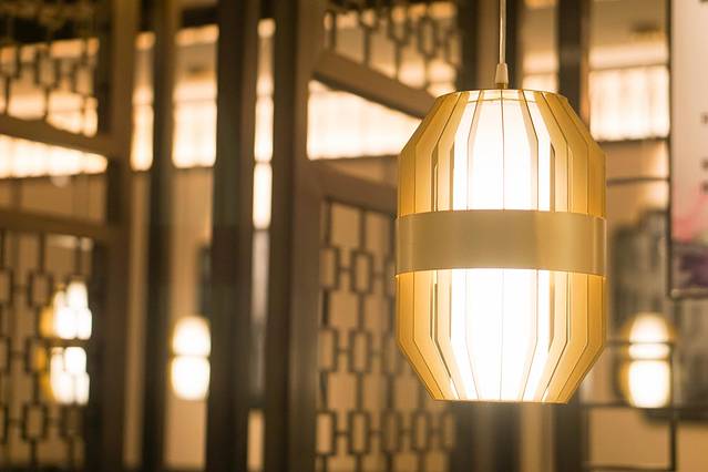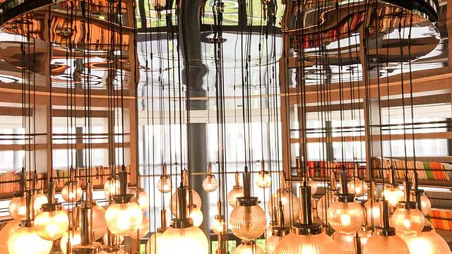 而顶部还有一个由很多“珍珠”组成的吊灯,往下一看,层层叠叠,圈圈分明,形成了视觉上的深邃纵深感。
