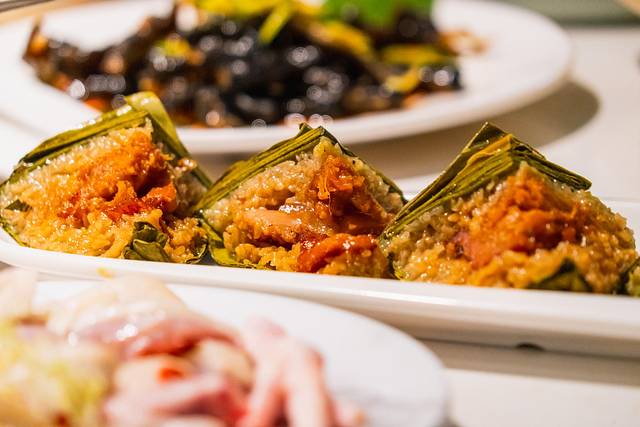 海南 黑猪肉粽要趁热吃呀,糯米中有咸蛋黄,吃起来也是咸香味俱全,随着粽子叶和糯米的清香一起下肚,很有饱腹感。