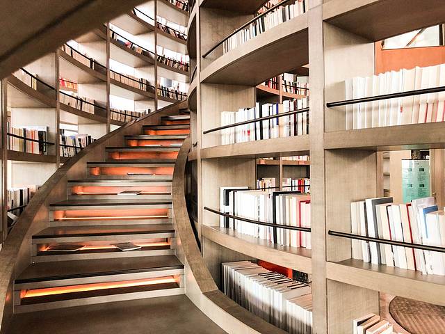 这六余米的圆筒形书架上边密密麻麻地摆满了书籍,走入其中,感觉置身于书的海洋,有种被书包围的感觉。