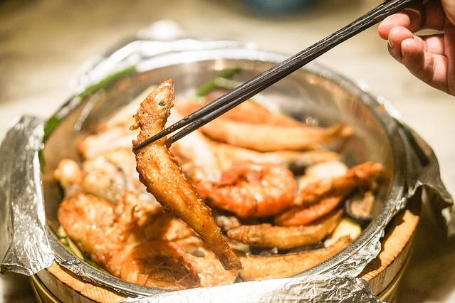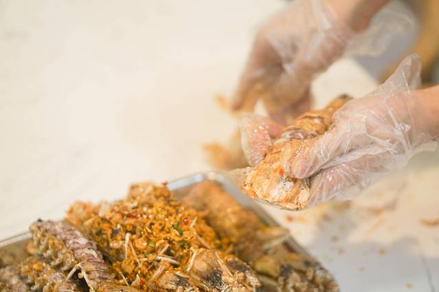 这道菜还原了海南船居渔民日常舌尖上的味道。食材方面选择的多是海虾、海鱼、墨鱼仔等,经过油炸过后,铝箔包裹,蒸笼上桌。剖开铝箔时,看到金亮诱人的鱼肉,我就忍不住流口水啦。满口都是蛋白质,好有营养价值。