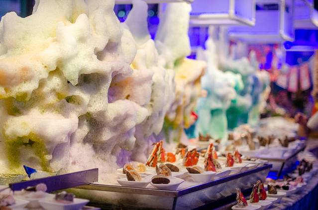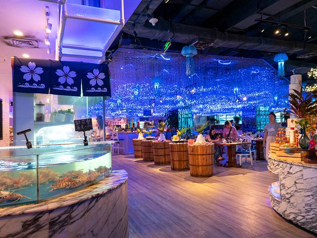 餐厅的海鲜种类还是非常的多,进门便是自助捞取的各色海鲜,仿佛就像是到了海鲜市场一般。不仅如此,在这里还能无限量的吃到黄金鲍鱼、三文鱼刺身、北极贝等海鲜,而且做法多种多样,从清蒸到烧烤亦或是涮火锅,你喜欢就好,当然除了海鲜其他在市场上能吃到的美食,这里几乎都有,真的是多到不知道吃什么!