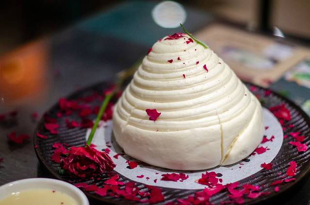 这家的菜品兼容传统和创新,传统的手工豆腐、创新的玫瑰馒头,这道玫瑰馒头端上来时便吸引了周边许多人的目光。经过极度低温的冷冻,玫瑰花已经变得无比干脆,服务员将玫瑰花悬在馒头的上空,轻轻一拍,玫瑰花应声粉碎落在馒头山,整个过程非常有意思,馒头的口感也非常的软糯。