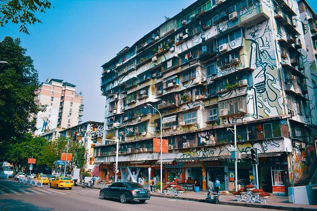重庆最有色彩的一条街,那就是黄桷坪正街涂鸦一条街。整条街全长1.25公里,在这条不长的街道上,从楼房、墙面,到校园、店铺外墙上等,满满都是涂鸦,相当于一条巨型的3D涂鸦画作。