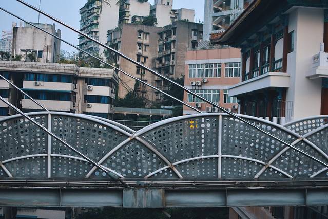 位于高盛大厦22楼天桥,也是重庆最近兴起的小众网红地。这里一共有两座天桥,从另一座取景拍照,可以拍出一些很有感觉的照片。