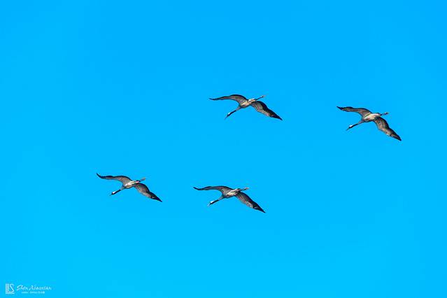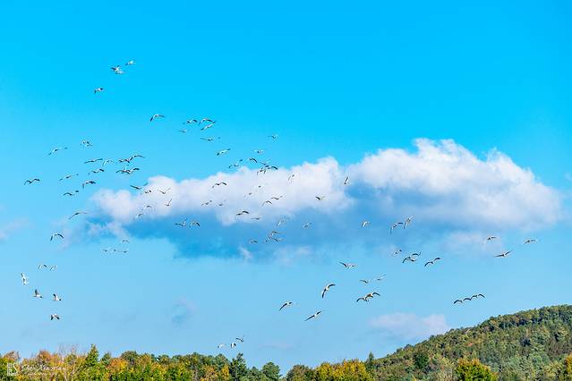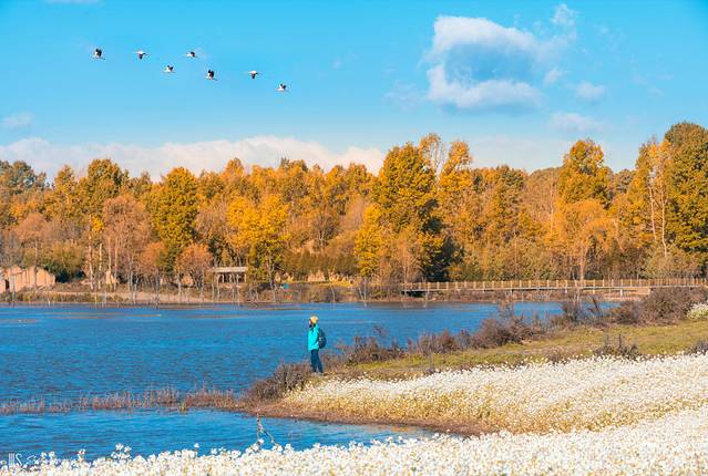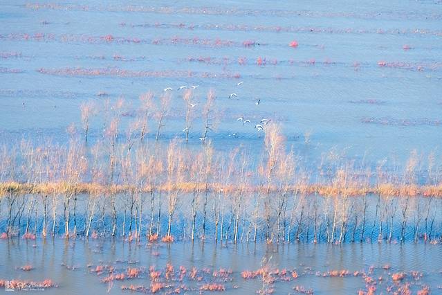念湖曾经有一个非常革命的名字——跃进水库,当年把湿地改造成了水库,而随着水位的上升,这里就成为了候鸟们的天堂,成群的黑颈鹤、斑头雁、赤麻鸭奏响清脆的晨曲,排好队形纷纷外出觅食,这些富有灵性的精灵们,在天空中自由翱翔,那一低头的温柔,引来无数快门的节奏,那一转瞬的娇羞,定格天空中最美丽的画轴……