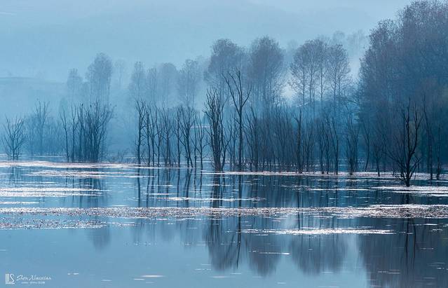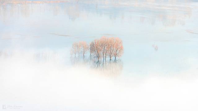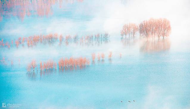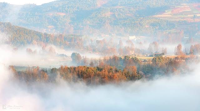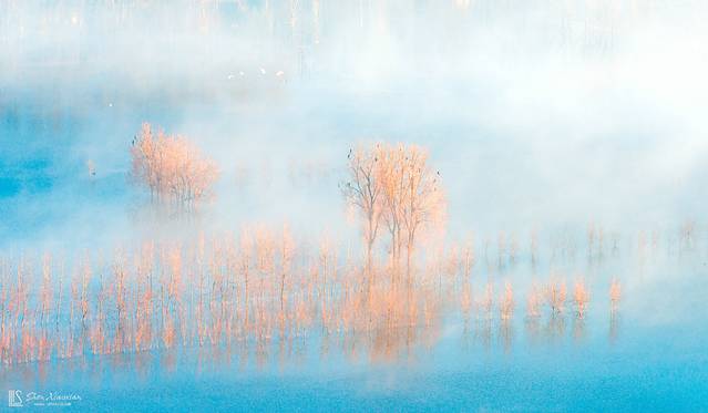 人间仙境不过也就如此吧,无论湖面还是树枝和群山,都被一层层薄雾掩映,水墨丹青画跃入眼帘,一派静谧的自然画卷展现在眼前。
