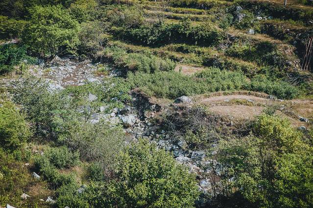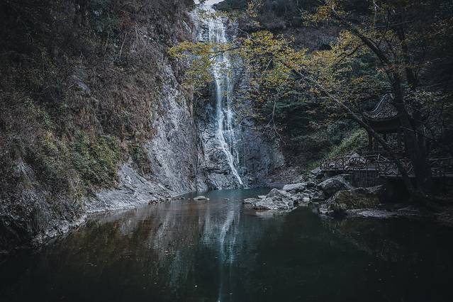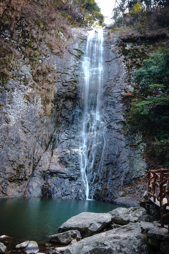 清冽的溪水涓涓流泻着,叮叮咚咚地,因地而歌,有如松涛,有如竖琴,铮铮涂徐之音,响彻山林之间。而垂落的溪水又如一条条银白色的细蛇,在石畔间蜿蜒流落。