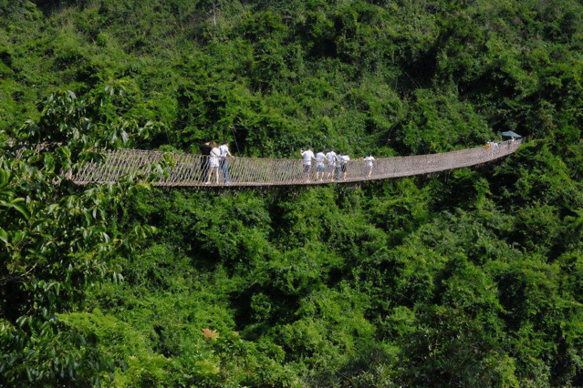 过江龙索桥是电影中的一个重要场景,舒淇和葛优从这里走过。这座铁索桥长168米,离地40米,连接两座小山,身边是茂密的森林,现在从这里走一趟要单独收费20元,也成了许多婚纱摄影的场景。我走在上面还有点害怕
