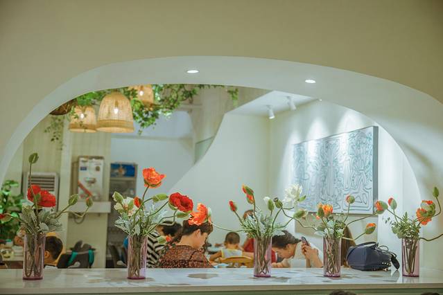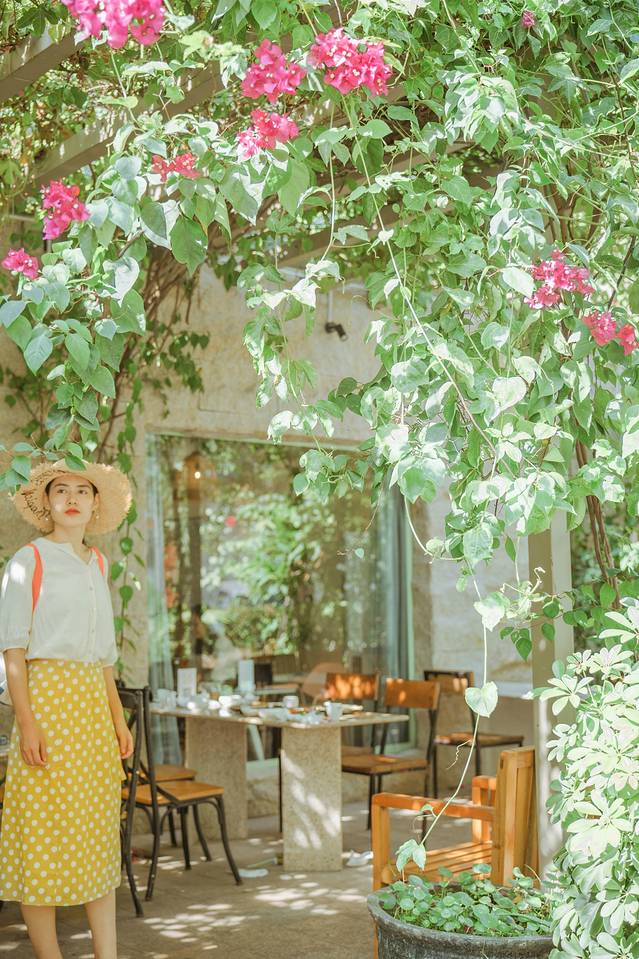 入口处是茂密的藤蔓和盛开的三角梅,室内的装饰也颇为清新典雅。