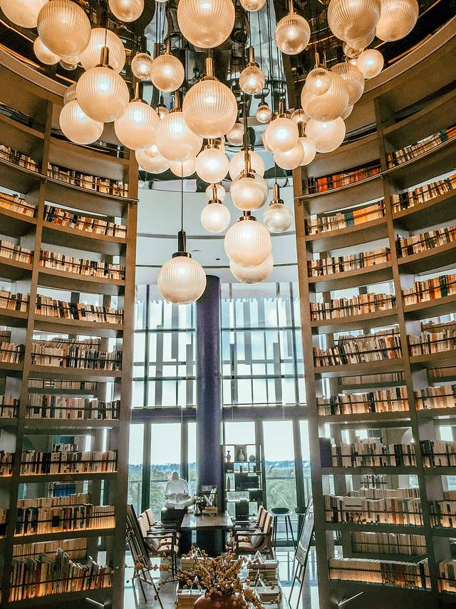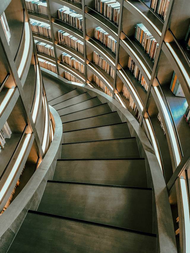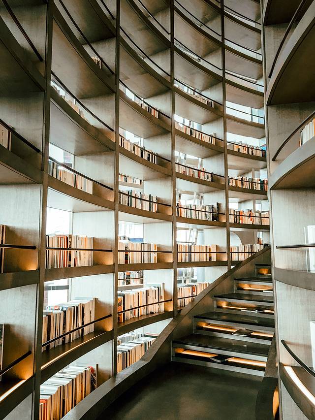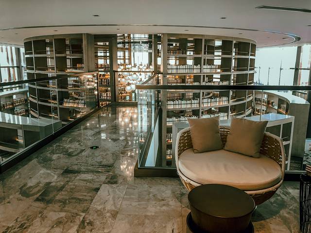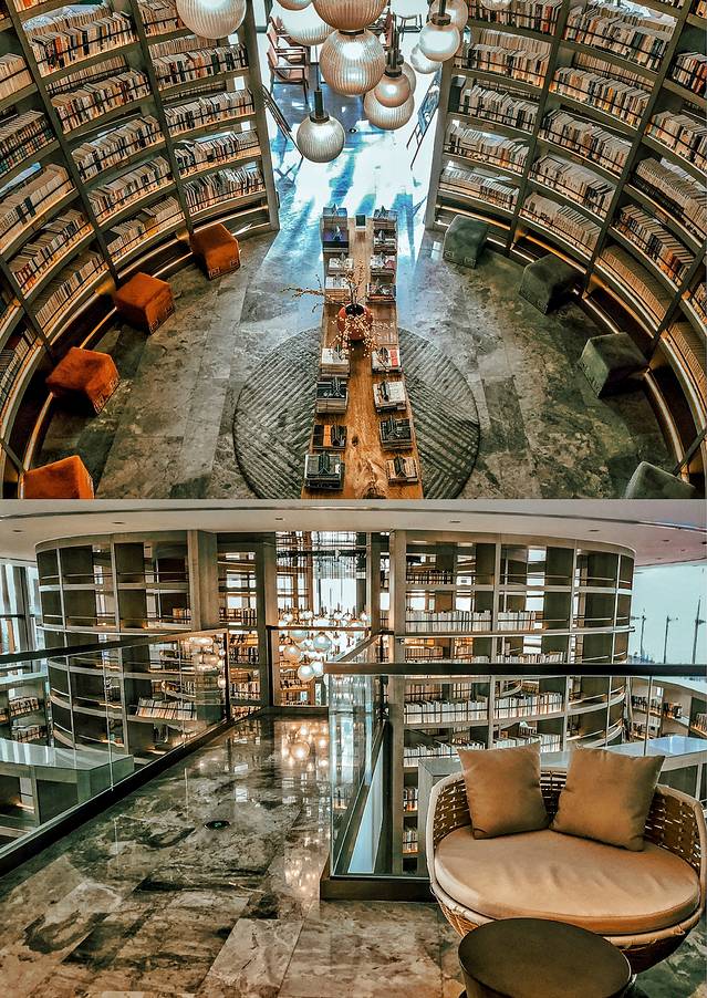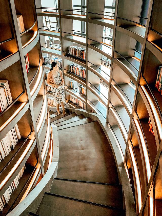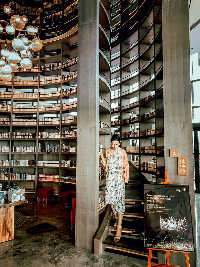 两层楼高的圆通书架,宛如书海将人360度环绕,沿木质台阶上楼,仿佛踏步于知识的阶梯。