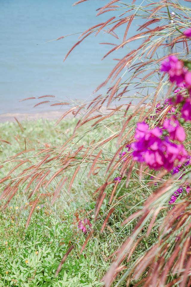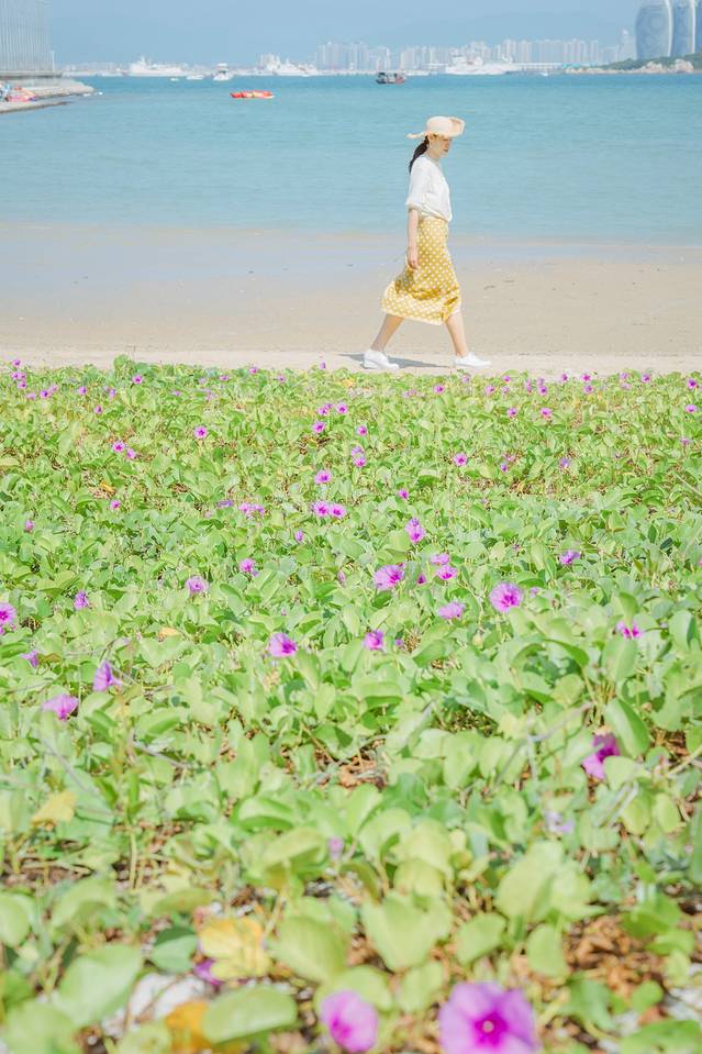 沙滩虽小,却是一幅生机勃勃的景象:细沙上牵牛花洒满一地,海滩旁三角梅迎风飘扬,连野生的狗尾巴草也舞的正欢……