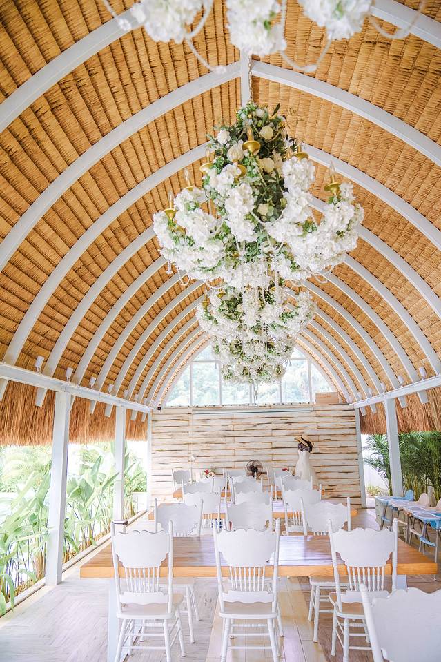 餐厅的吊灯非常有婚礼的气息,白色的花朵配着烛台,原木色和白色的搭配也颇为清新,是不是应该来一曲《婚礼进行曲》?