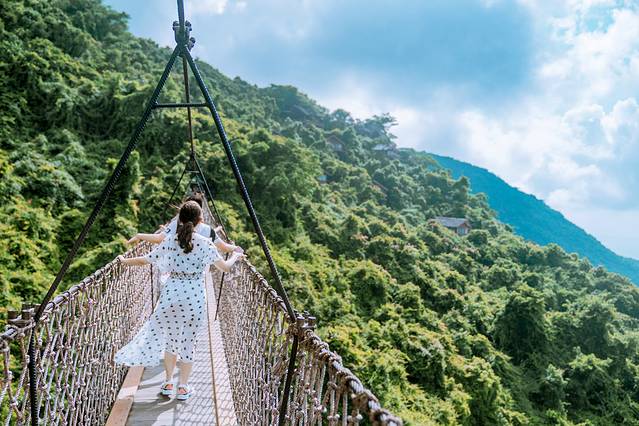 继续乘车上山,就来到了必打卡的过江龙索桥,当时非诚勿扰的海报就是在这里取景,因而印象深刻。最近热门的《亲爱的,热爱的》,又让这里再次被人记起。