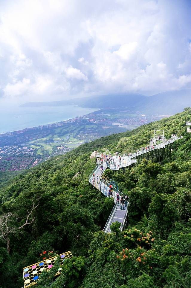 刚踏上索桥的我,还在自在地看风景:山间的小木屋、近处的热带雨林、远处的 亚龙湾 ,伴着小风望远景,别有一番风味。