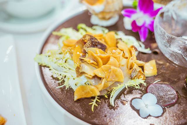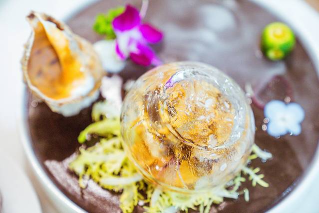 冰盏香螺片,颜值最高的一道菜,透明的冰碗倒扣在海螺上,再添上干冰,很适合拍照。