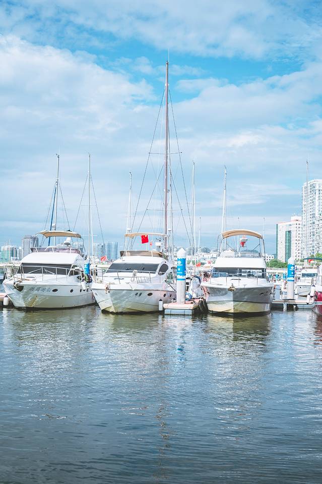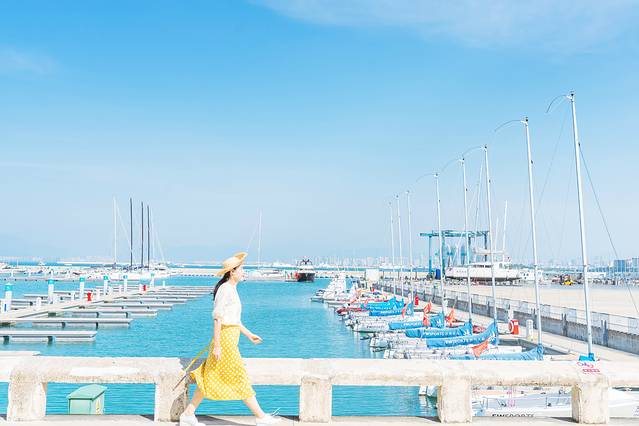 码头边上,整齐排列着一排排白色的帆船,在碧海蓝天下,等待着迎接大海的风浪。