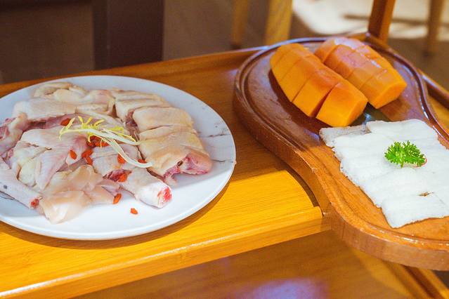 椰子水开后,再加入木瓜、竹笙、椰肉、红枣、枸杞等养生食材,待锅底煮好,鸡肉就可以下锅了,三分钟后关火,鲜甜弹嫩的椰子鸡就出炉了!