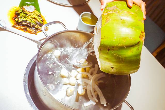 店员哗啦啦地把三个椰子水全倒在锅里,再配上一瓶农夫山泉,这锅底也太真材实料了吧,我和老公面面相觑,心想我们在 广州 吃的是啥