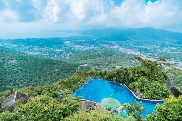 过了索桥向前走,便可以登上千里伞俯瞰深蓝色的无边泳池。在这里游泳看风景,一定很享受吧!