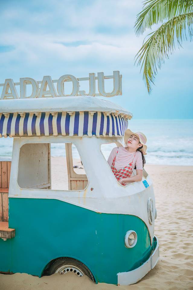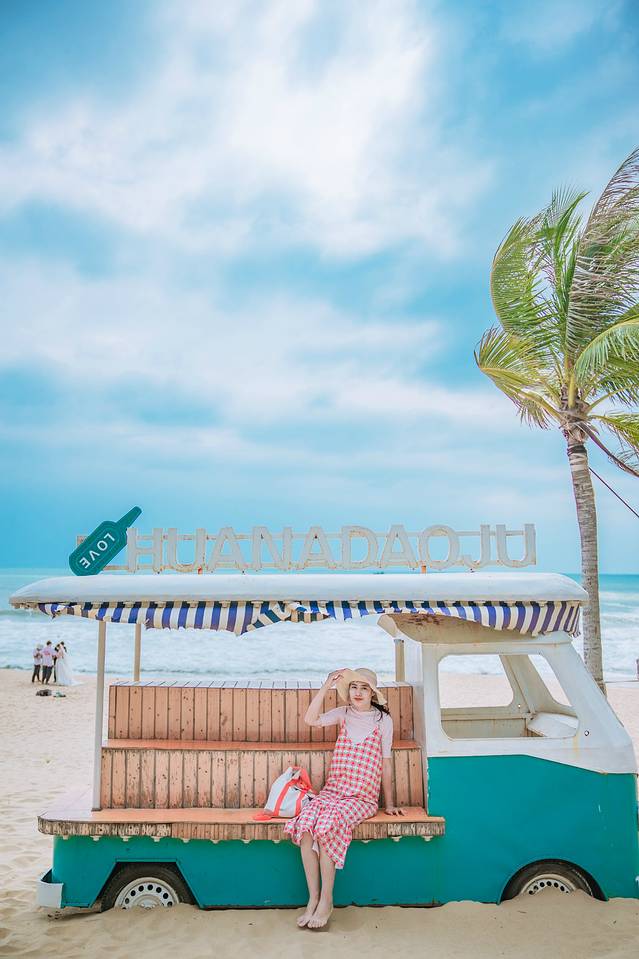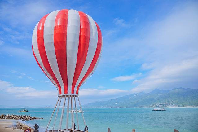 第一站,在热气球旁边下车,海边的网红拍照点,几乎都集中在这里,最具标志的便是红白相间的热气球,虽然不能乘风飞起,却让海岛更添了几分俏皮。沿着海滩继续向前走,鸟巢、蓝白色的观海亭,都是不错的打卡点,如果你喜欢旅拍,请不要错过这里。
