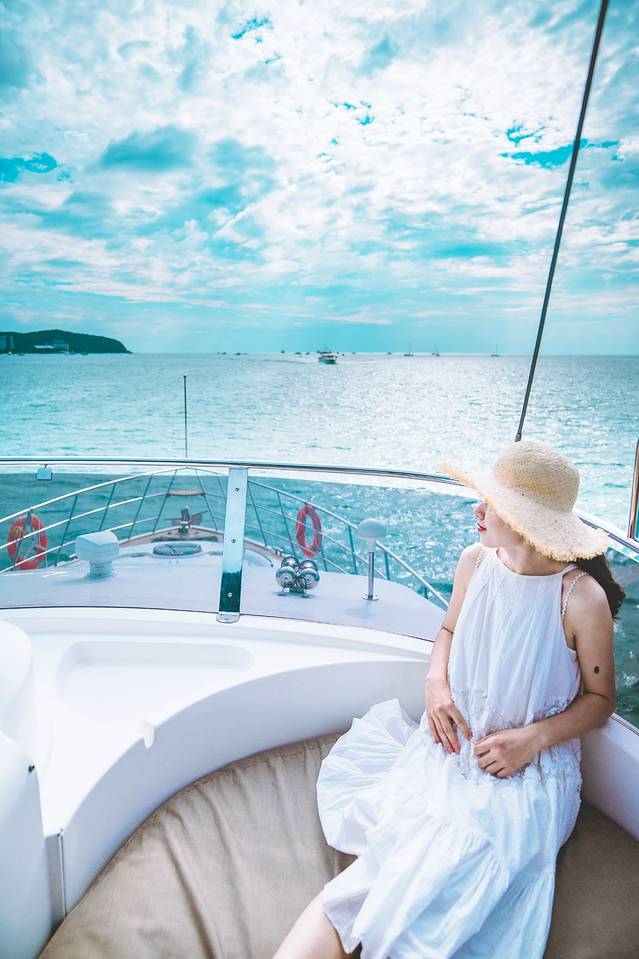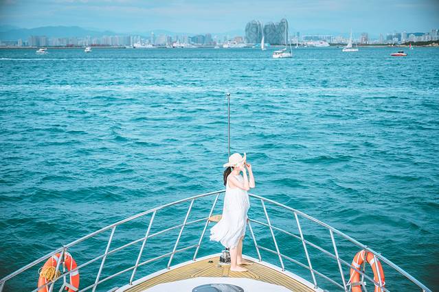 经过近半个小时的平稳航行,游艇停在了海中央,这时候就可以下来一层的甲板上吹吹海风了。