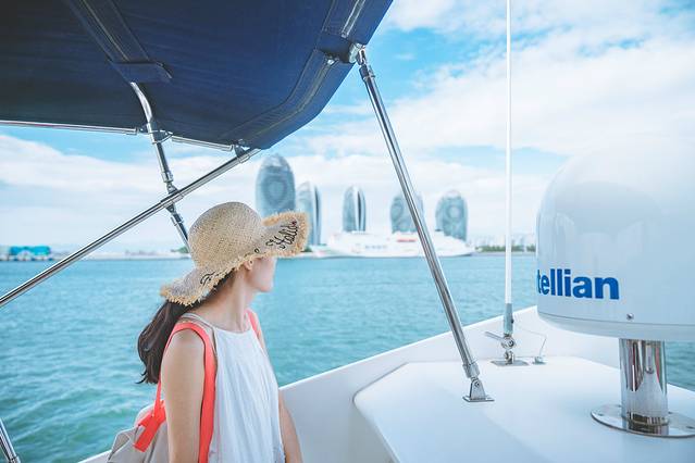 乘坐游艇出海,旁边不时驶过的白色帆船,是海面上独特的风景线。