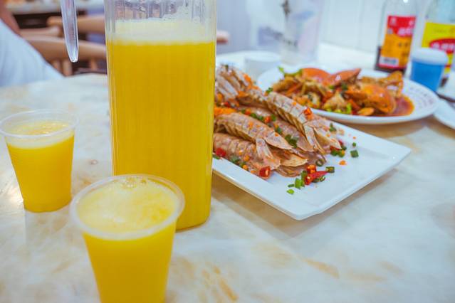 第一顿海鲜,担心漫天要价,干脆直接来了个龙虾的团购套餐,再单点一份皮皮虾和一扎鲜榨芒果汁。
