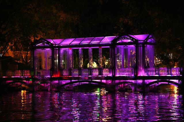 一座供市民休闲的凉亭在夜色下又泛出了新的色彩和光芒,在漆黑的夜空里显得格外的夺目。