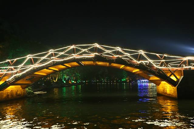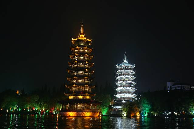 两江四湖包括了桂林市中心区的漓江、桃花江以及杉湖、榕湖、桂湖、木龙湖,是桂林的风景名片。水系发达的桂林城区乘船夜游也是非常值得一去的,夜色下的桂林又呈现出了一番不一样的精致,灯火辉煌的江水两岸被披上了一层璀璨的外衣。