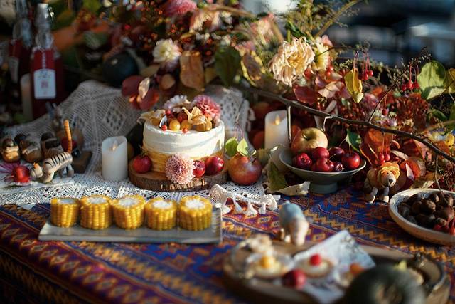 一楼大厅里,精致漂亮的鲜花甜品台已经搭好,枫叶,黄栌,秋菊,配合着南瓜蛋糕,栗子酥皮,还有蜡笔森林的管家阿姨们自制的小点心,山楂汁,村里采摘的苹果和海棠,一派深秋丰收景象,来到山里也不会缺失这份仪式感。