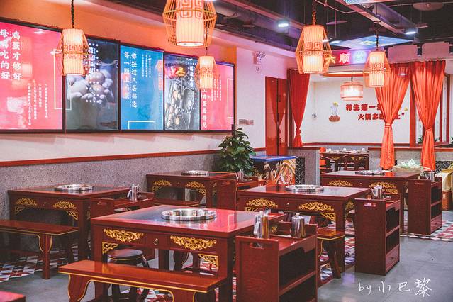 这家店装修喜庆, 中国 红,又是条凳大桌,非常带感。