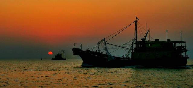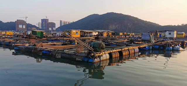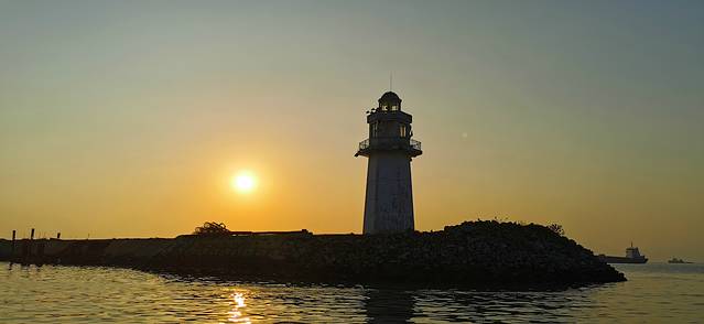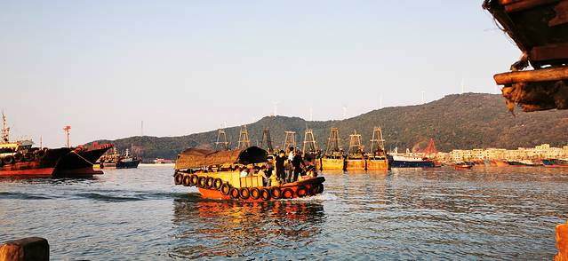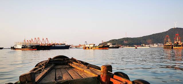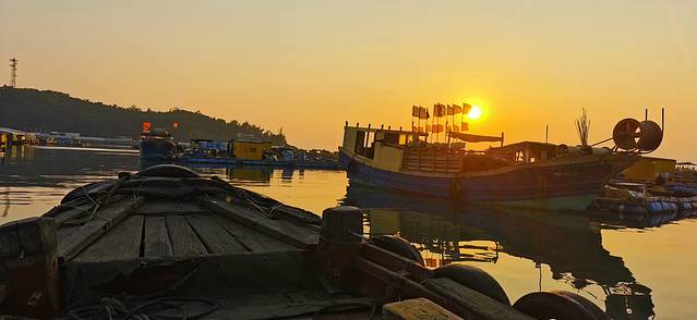 还是在空闲时间,翻看了一些驴友的攻略。海陵岛上有一个国家级的中心渔港,还可以在马尾岛观日落。既然今天看了日出,那么日落也不能少的。从博物馆走出来,已经接近4点半,不知道是否来得及赶上日落。就一路开车去中心渔港看看,碰碰运气吧。与靠岸的船家大叔商量,带我们出海去看日出,竟然以100元包船的价格成交。伴着小渔船“突突”的马达声,慢慢离开码头,穿梭在停靠的渔船之间,经过灯塔,就绕道港外,靠近马尾岛的地方,有成排的养鱼排,可以上去钓鱼,或者直接购买海鲜,也可在竹排上烹煮。小渔船从中心码头开出,到马尾岛大概半小时,可以选择上岛。我们看到日落已近,就放弃登岛,让淳朴的渔民大叔关掉马达,静静的看着日落,享受这种不经意的美、不确定的美。