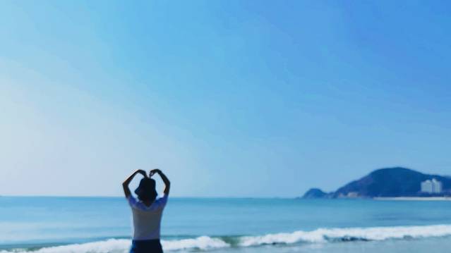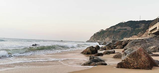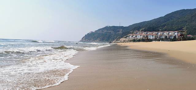 大角湾景区,也是收费的。很不理解,海滩的资源那么好,一定要通过收费来煞风景呀。哎!没有进景区,而是在靠近放生台的地方,在海边走走,天蓝蓝,很晒。