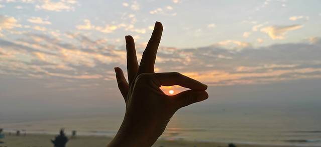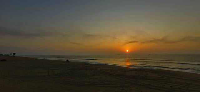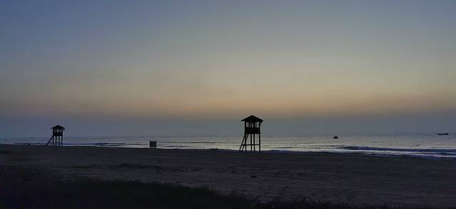 到海边,看日出日落,是必须要做的事情。原本在海之冠的楼顶,应该能看到太阳从山那边升起来,但还是心心念念的海上日出,所以,趁早,开车去了十里银滩那边。从海之冠向东沿着滨海大道,5、6分钟就到了,整个海滩空无一人。海滩收费,到处都是拿铁丝网拦着的,很煞风景。但是,也难不倒我们的热情,在栈道附近,还是能找到空隙,进入海滩。哈哈哈。