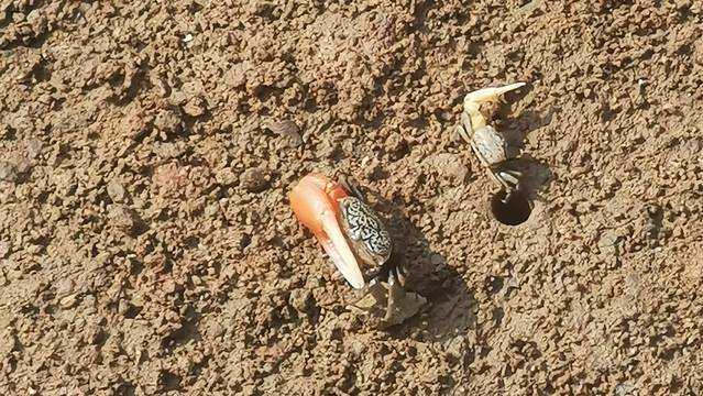 近处的绿色,就是红树林,涨潮时,海水就涨到这里,漫过红树林根部。带来水里的养料,供给生活在树下的小生物(招潮蟹、弹涂鱼啦)